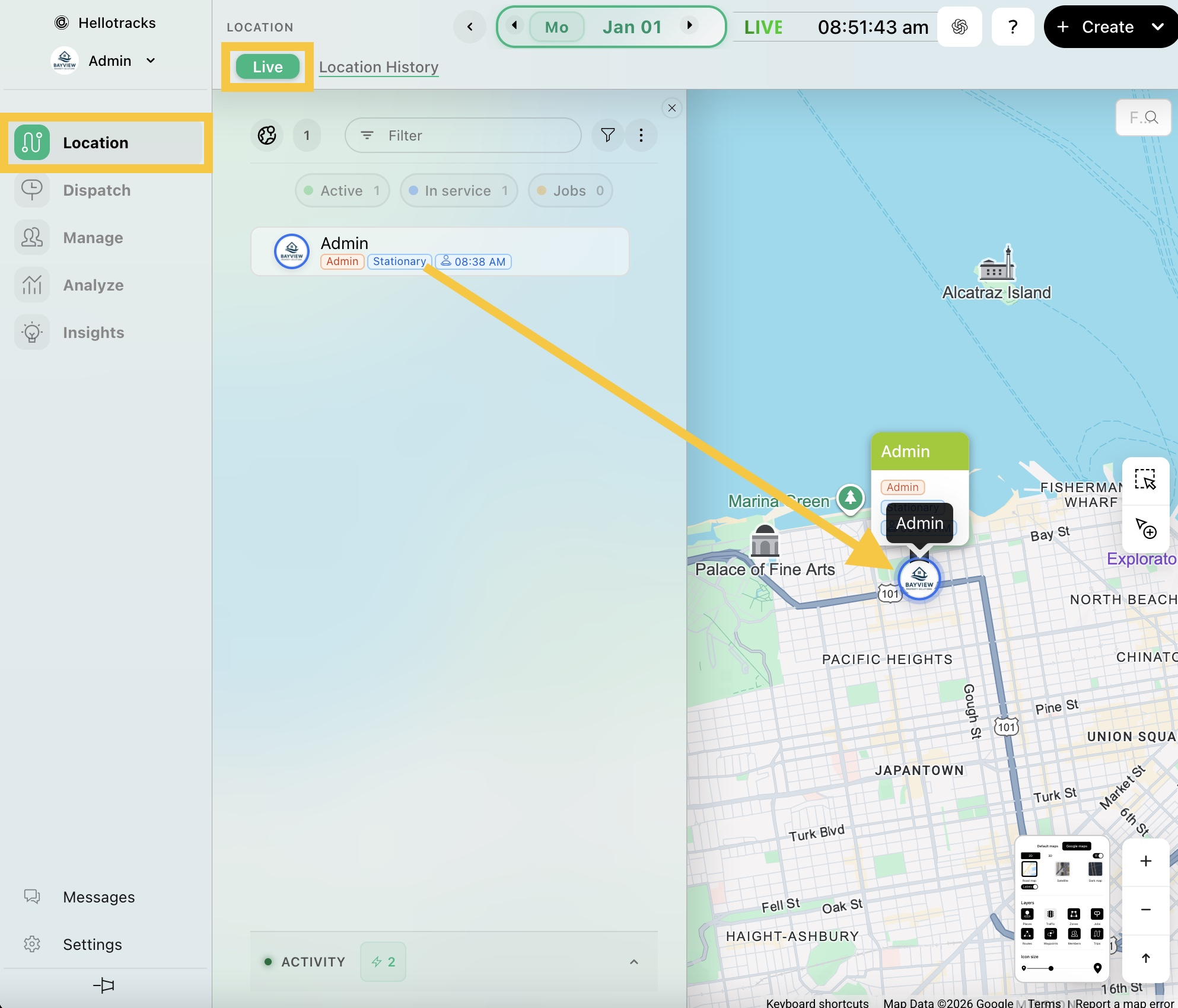 Una vez que instales la aplicación móvil e inicies sesión, ve al panel web y selecciona Ubicación (Location) en el menú principal, luego haz clic en En vivo (Live). Verás que tu icono de perfil aparecerá en el mapa. Podrás ubicarte en tiempo real y ver el estado de tu dispositivo, como estacionario o en camino.