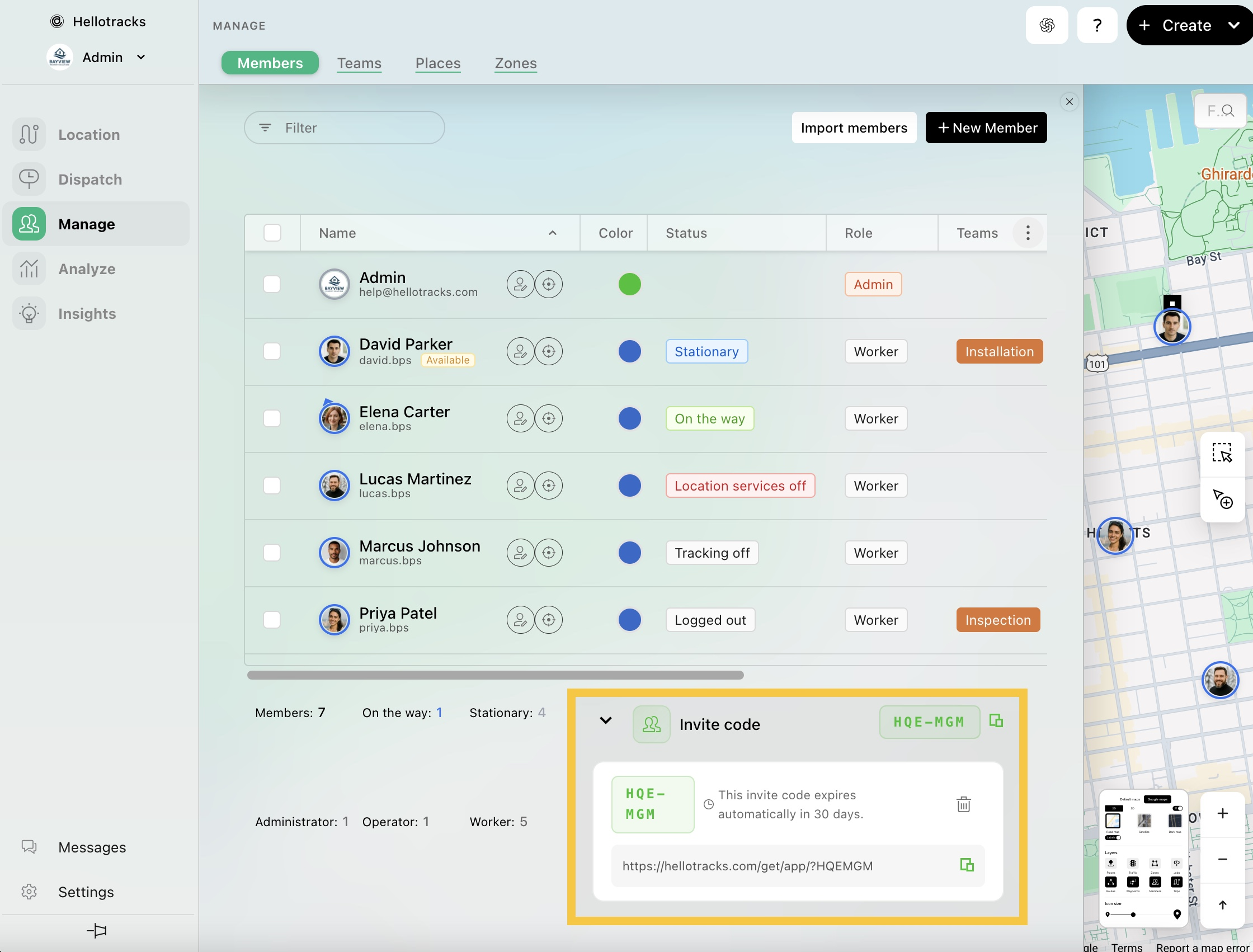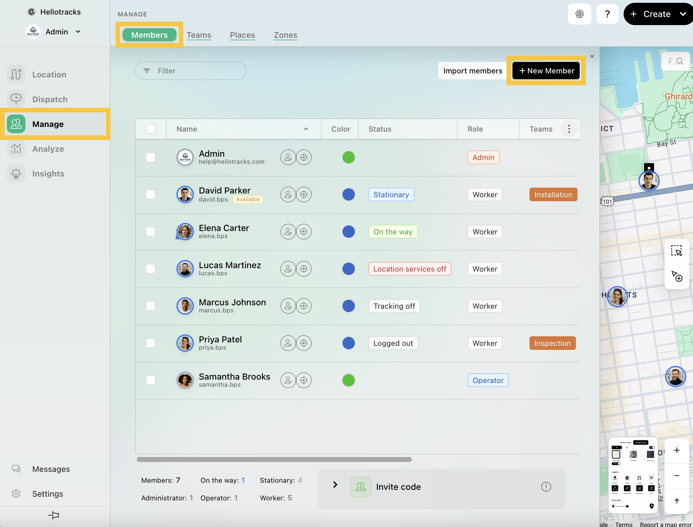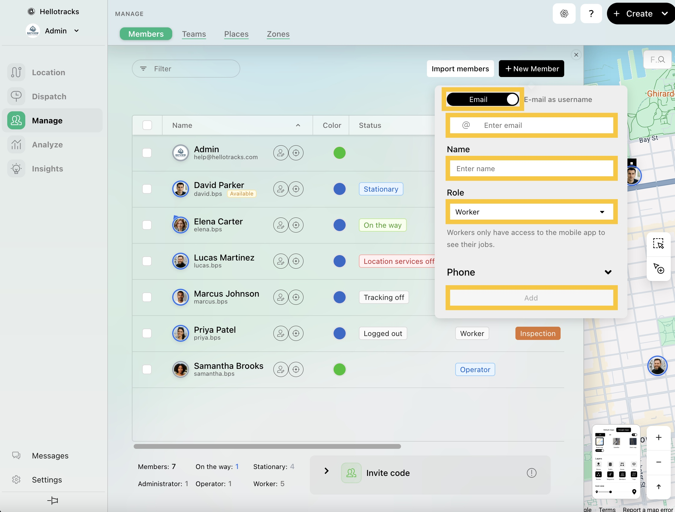 Ve a Administrar (Manage) y selecciona Miembros (Members). Luego, haz clic en + Nuevo miembro (+ New Member). Puedes crear a este miembro utilizando una dirección de correo electrónico. El correo electrónico será su nombre de usuario de inicio de sesión de Hellotracks.