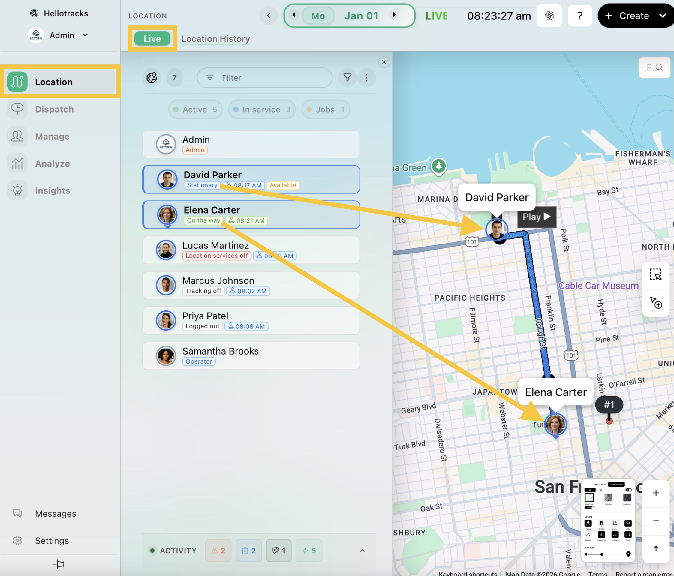 Todos los usuarios que activen la aplicación móvil aparecerán en el mapa En vivo (Live). Podrás seguirlos en tiempo real desde el mapa En vivo (Live) y ver el estado de cada usuario (p. ej., estacionario (stationary) o en camino (on the way)).