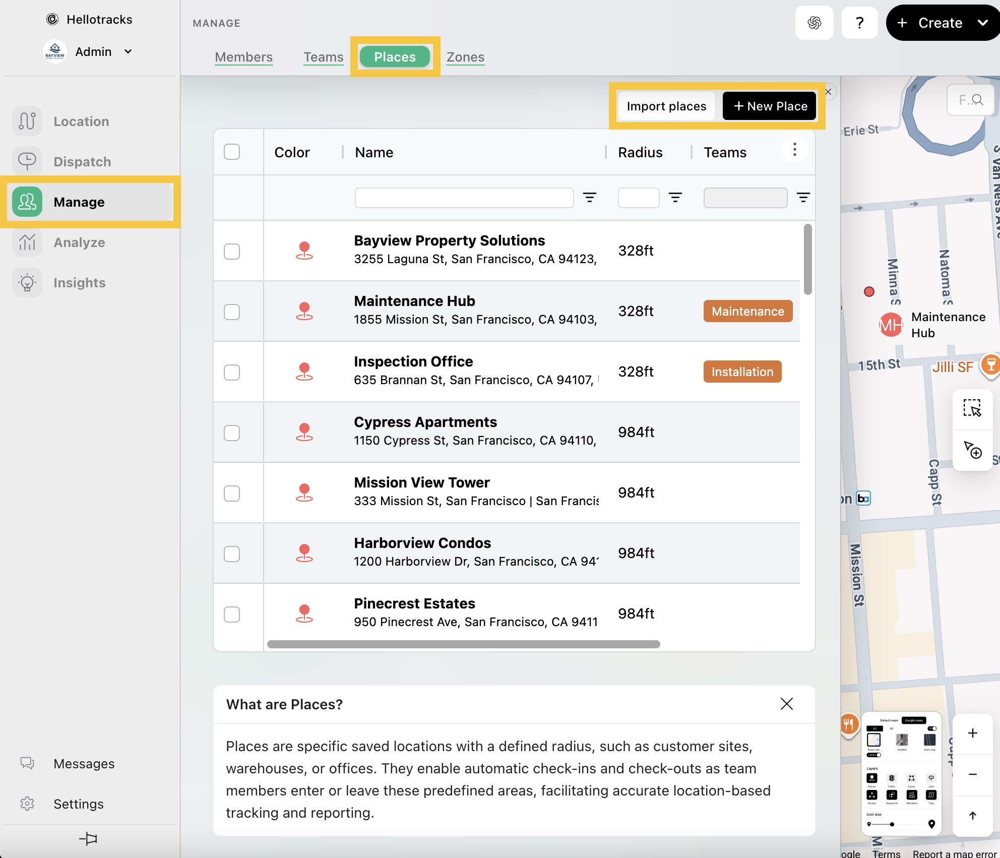 Desde Administrar (Manage), simplemente ve a Lugares (Places) y haz clic en + Crear Lugar (+ New Place) para agregar una nueva geocerca. Si deseas agregar múltiples ubicaciones, puedes utilizar la hoja de cálculo disponible o descargar la plantilla en Importar lugares (Import places).