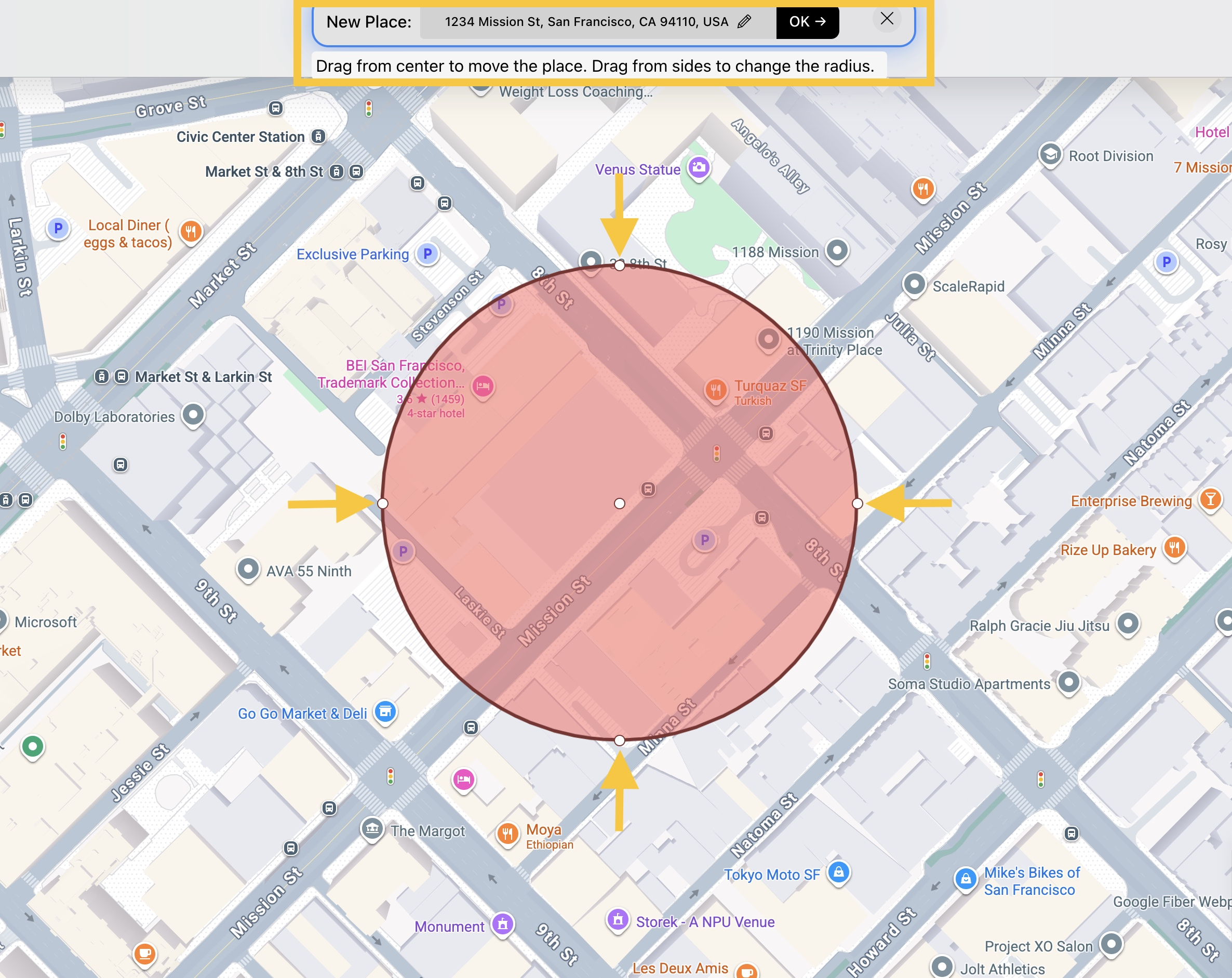 Arrastra el círculo desde los lados para cambiar el radio.