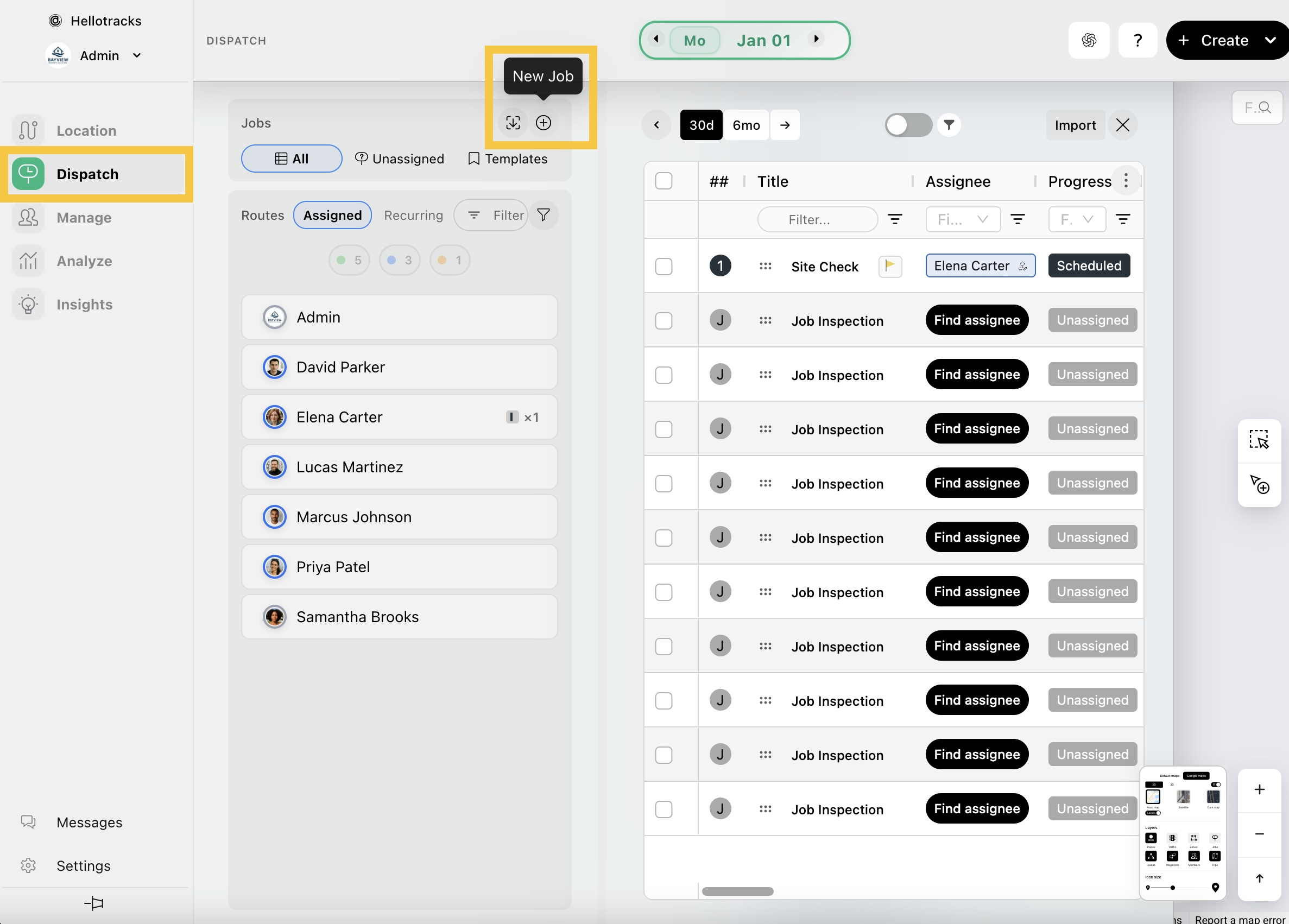 Ve a Despacho (Dispatch) y haz clic en + (Nuevo Tarea) (New Job) para crear una nueva Tarea. Si deseas crear múltiples Tareas, puedes usar la hoja de cálculo disponible o descargar la plantilla haciendo clic en la flecha hacia abajo dentro de un ícono cuadrado (Importar tareas) (Import jobs).