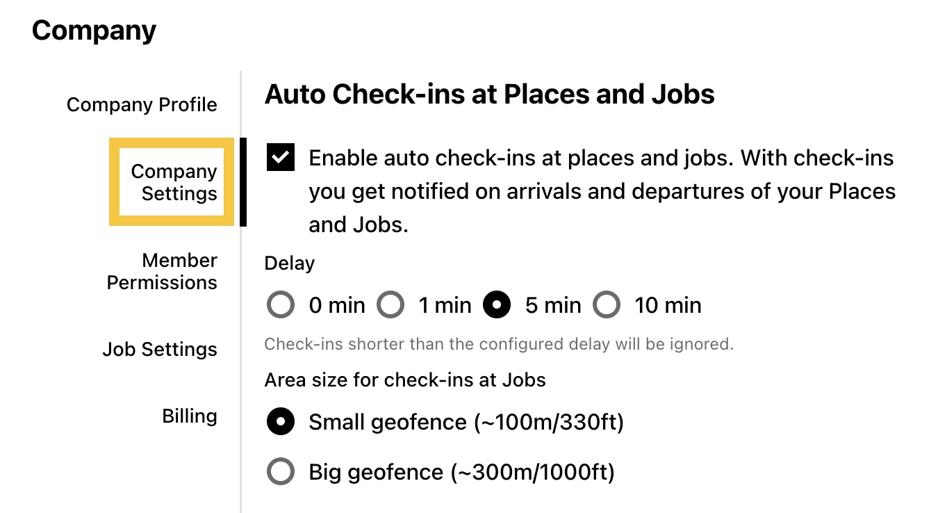 Personaliza tus ajustes de entrada/salida para Lugares y Tareas haciendo clic en el menú desplegable debajo de tu perfil y seleccionando Empresa (Company) (ver captura de pantalla en 3. Permisos de Usuario). Luego, ve a Configuración Compañía (Company Settings).