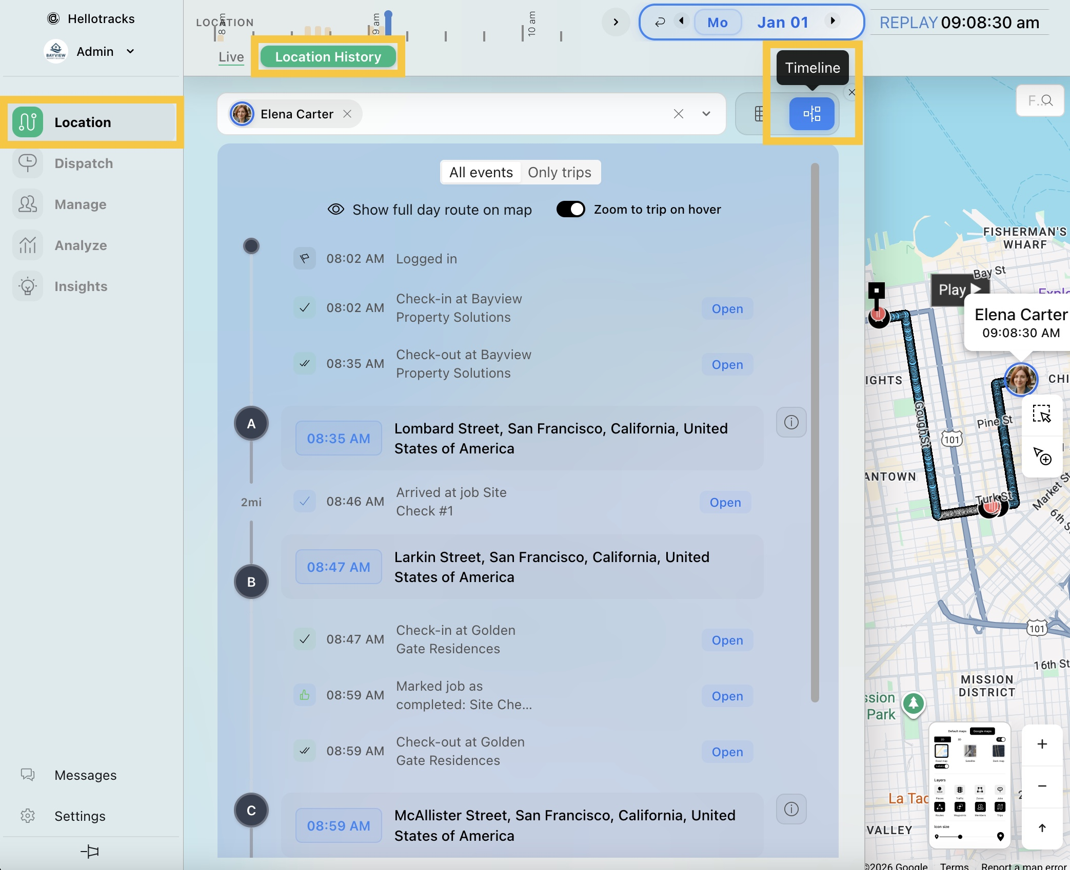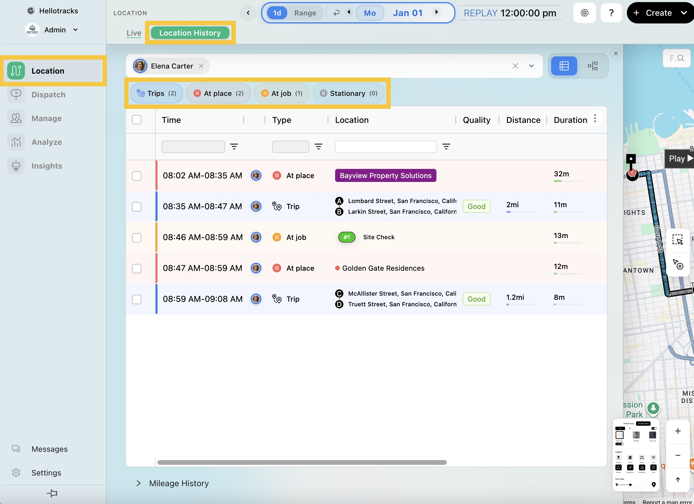En Historial de Ubicación (Location History), Rutas (Trips) muestra cada ruta recorrida incluyendo su ubicación de inicio, destino, calidad, distancia total y duración. Mientras las Paradas (Stops) se clasifican como En lugar (At place), En tarea (At job), o Inmóvil (Stationary) (fuera de ubicaciones definidas), mostrando cada pausa y su duración total.