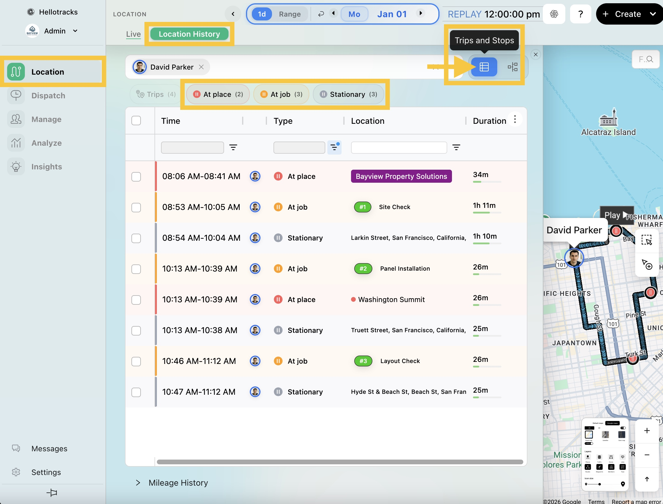 - En la vista Rutas y Paradas (Trips and Stops), aplica el filtro En lugar (At place), En tarea (At jobs) o Inmovil (Stationary) (fuera de ubicaciones definidas) para ver los registros y el tiempo total en el sitio de cada miembro.
