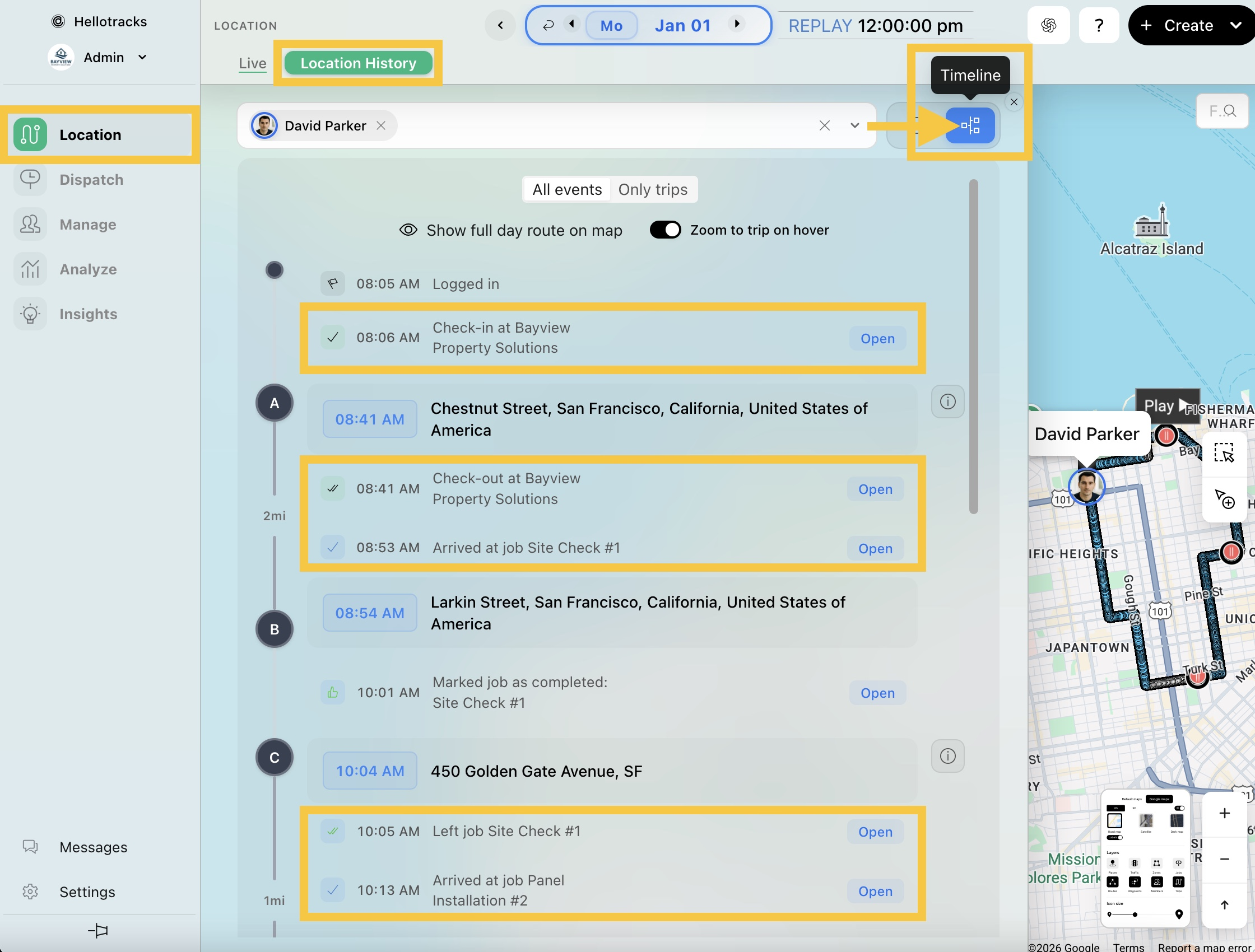 Hellotracks Business permite el registro automático de check-ins (entradas) y check-outs (salidas) sin necesidad de intervención manual cuando los miembros del equipo llegan a o salen de Lugares o Tareas.