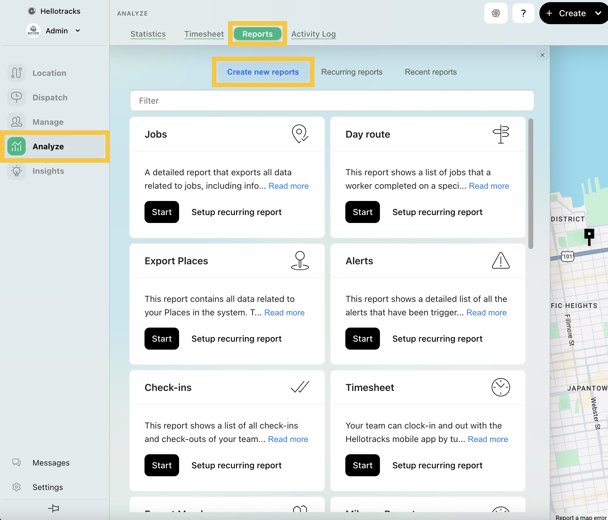 Paso 5: Para exportar los datos, ve a Reportes (Reports) en la sección Análisis (Analyze) del menú principal. Luego, selecciona Crear nuevos reportes (Create new reports).