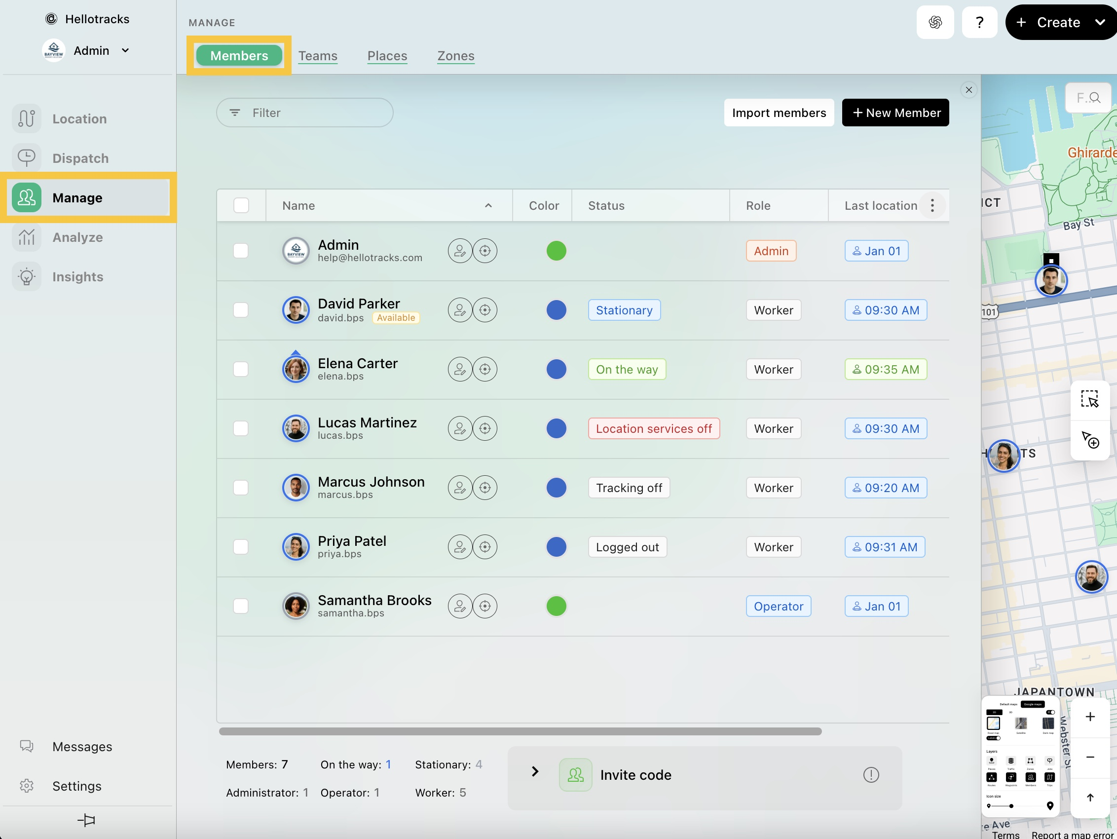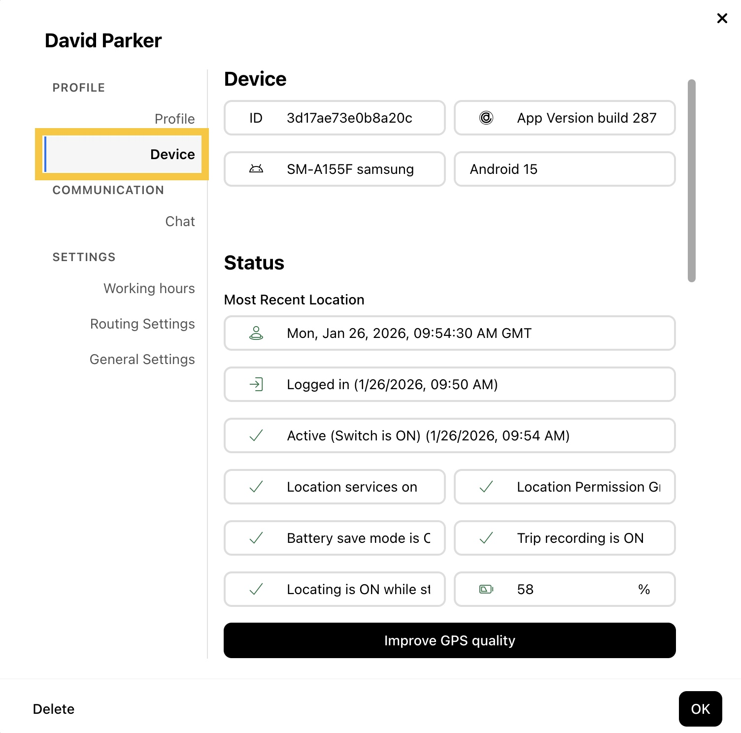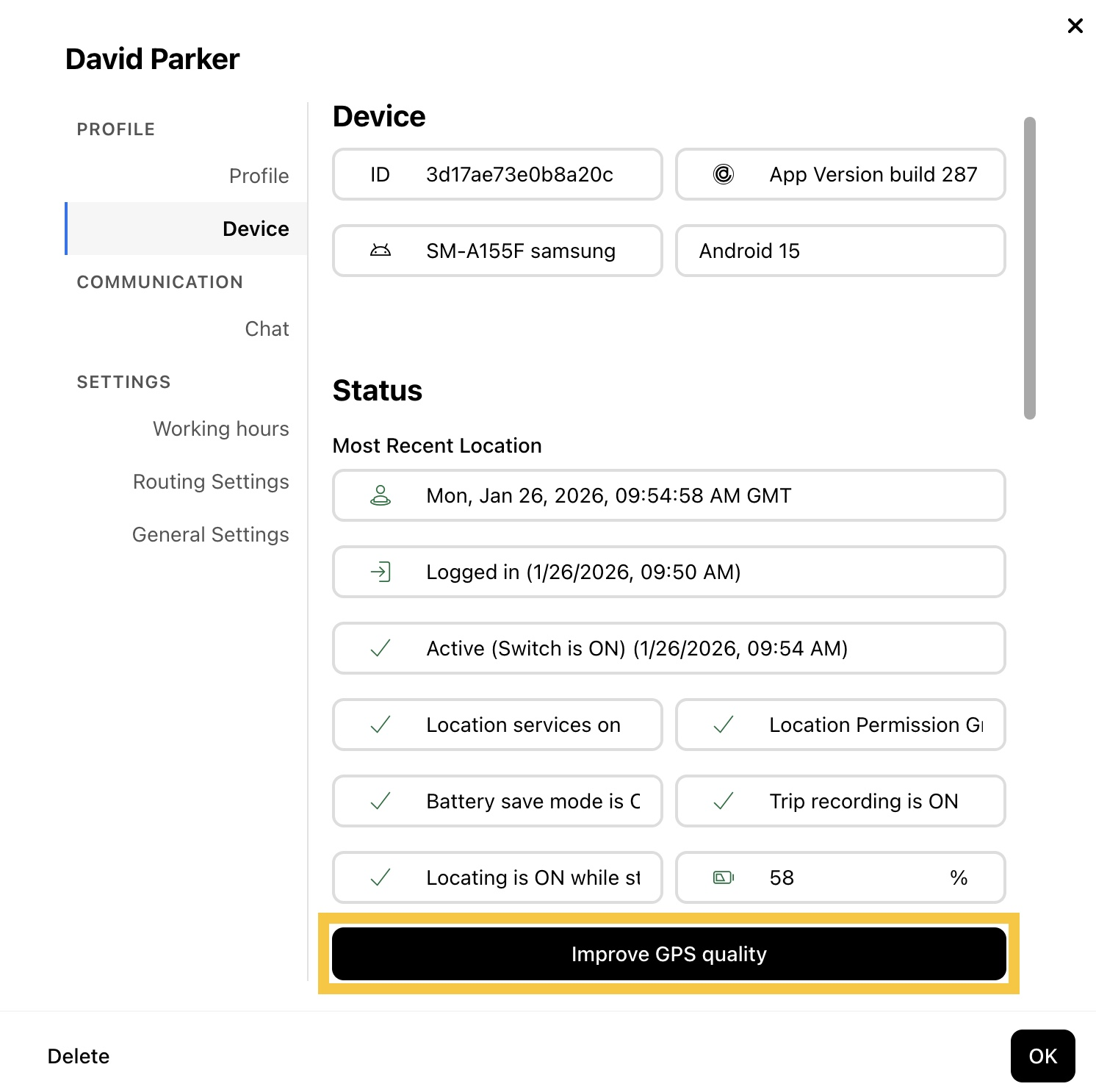Si el dispositivo del miembro del equipo parece cumplir con todos los criterios para un seguimiento óptimo en tiempo real y aún experimenta problemas o retrasos, confirme primero que su dispositivo esté ENCENDIDO y tenga una conexión a internet activa. Luego, puede proceder con los siguientes pasos desde el panel web (web dashboard).