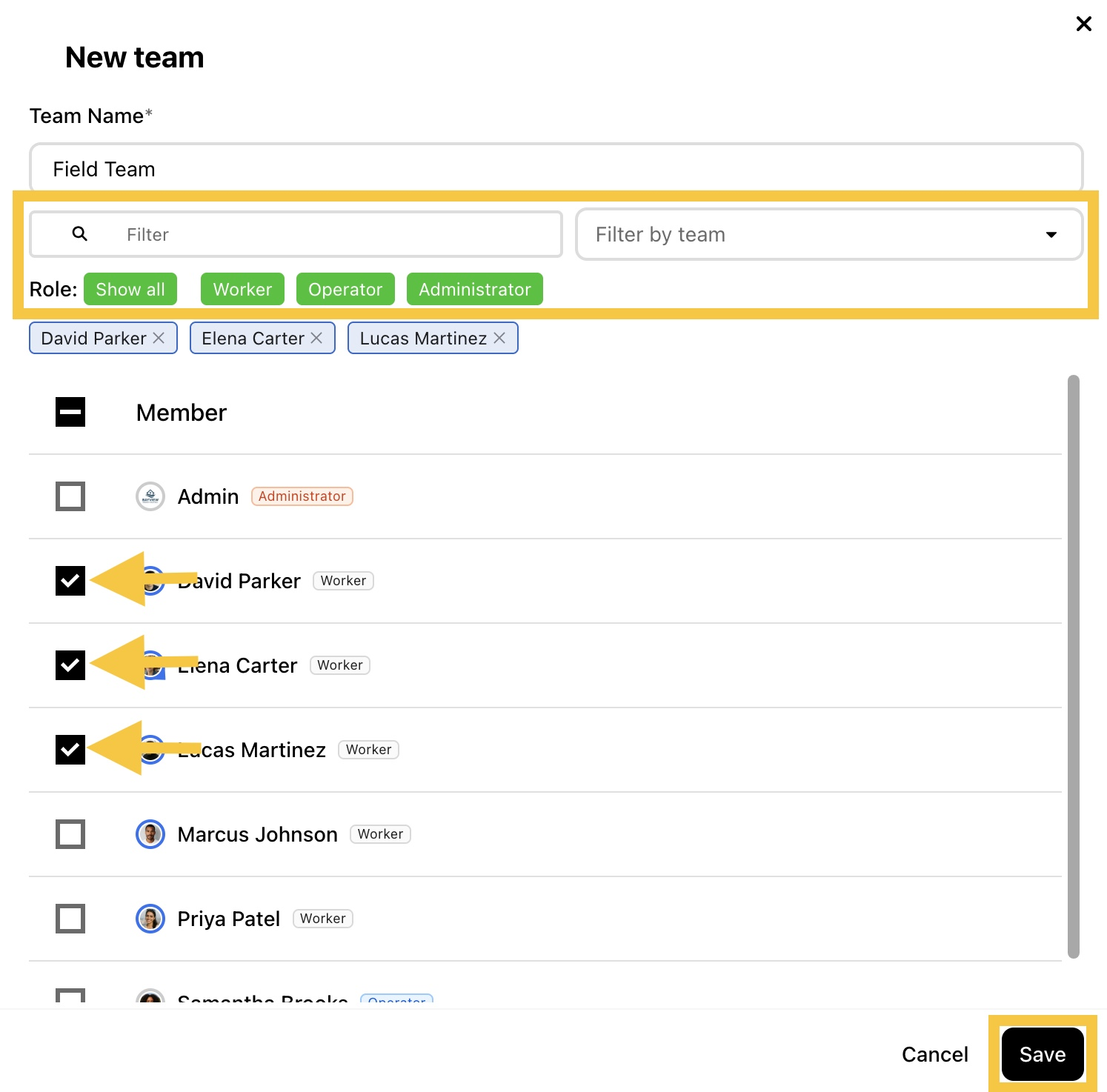 Paso 4: Selecciona los miembros que deseas agregar. Usa las opciones de filtro para mostrar solo miembros específicos. Luego, haz clic en Guardar (Save).