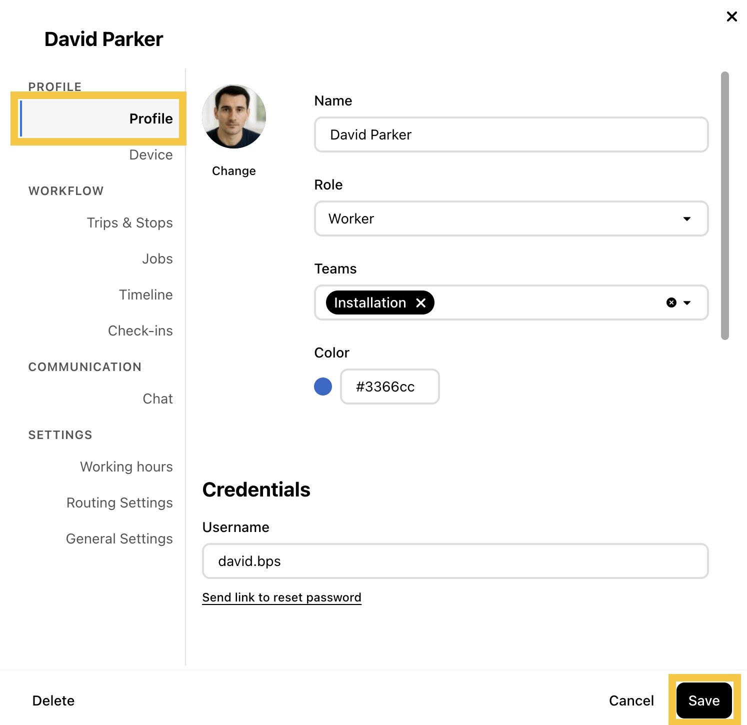 Paso 3: Selecciona Perfil (Profile). Aquí, puedes actualizar detalles como su nombre, foto de perfil, rol, asignación de equipo, color del perfil e información de contacto. Luego, haz clic en Guardar (Save).