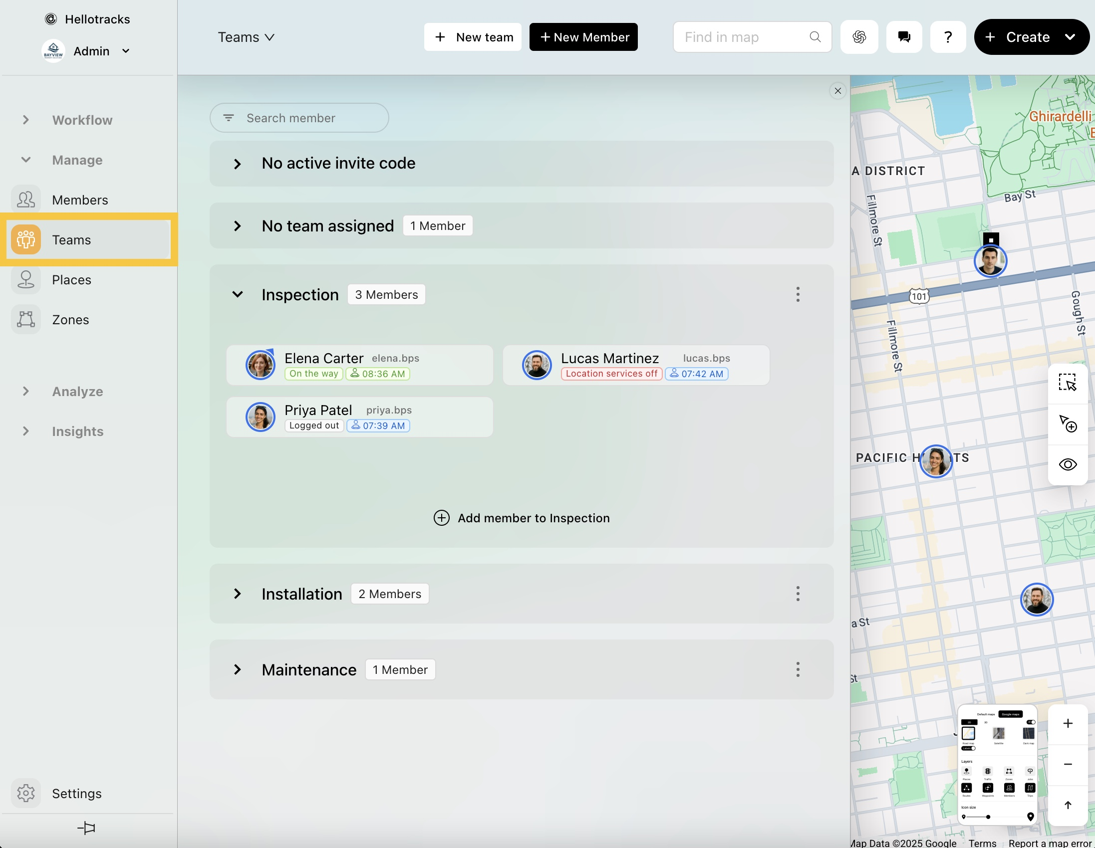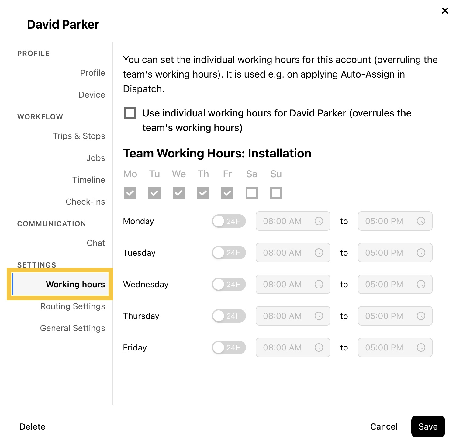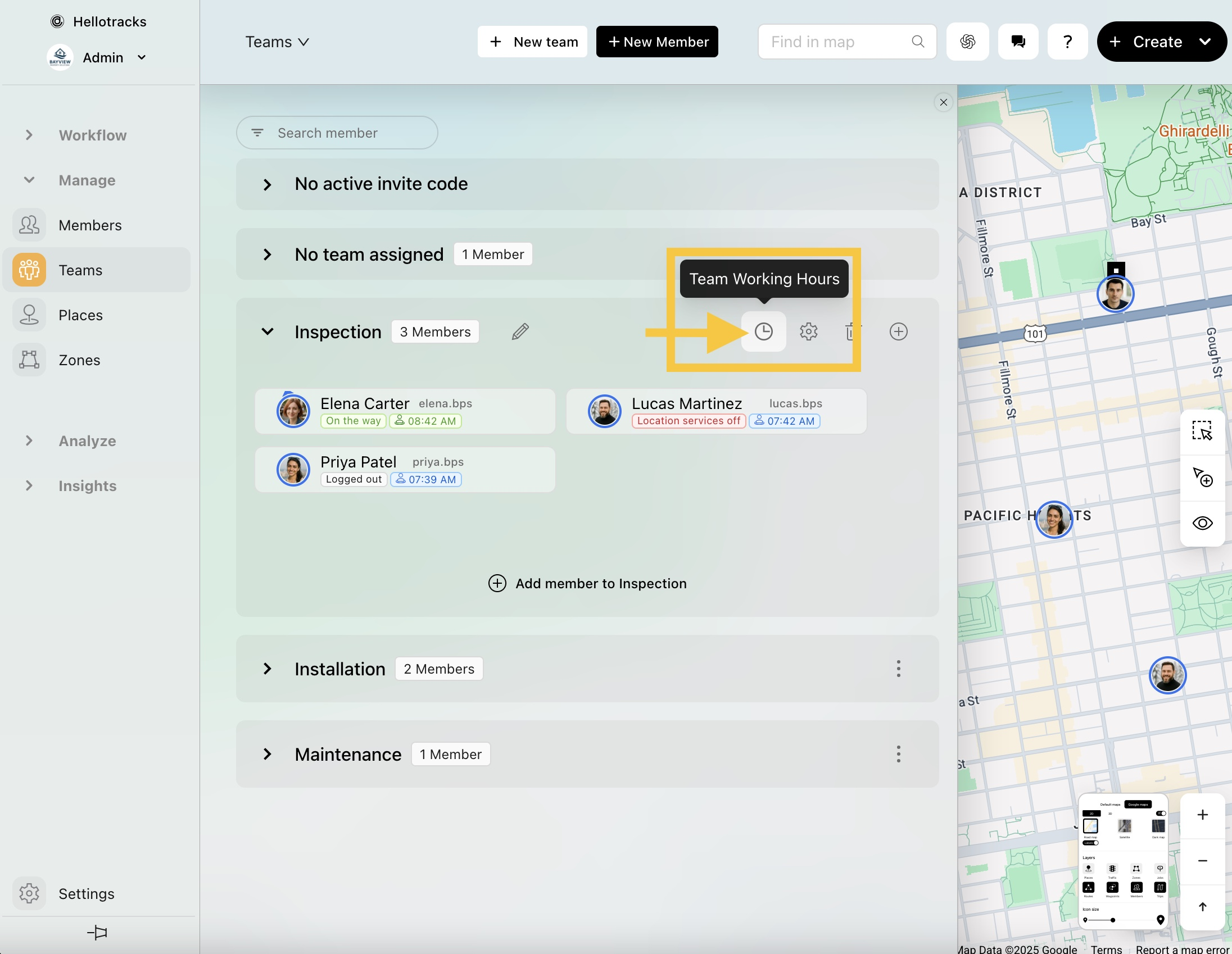 Esta guía explica cómo establecer horas de trabajo para miembros individuales o para todo un equipo. Cuando se activa en la configuración de la empresa, las horas de trabajo pueden desactivar automáticamente el seguimiento fuera de esas horas en la aplicación móvil. Las horas de trabajo también se utilizan en Resolver Ruta y Buscar asignado para apoyar la programación de Tarea basada en la disponibilidad.