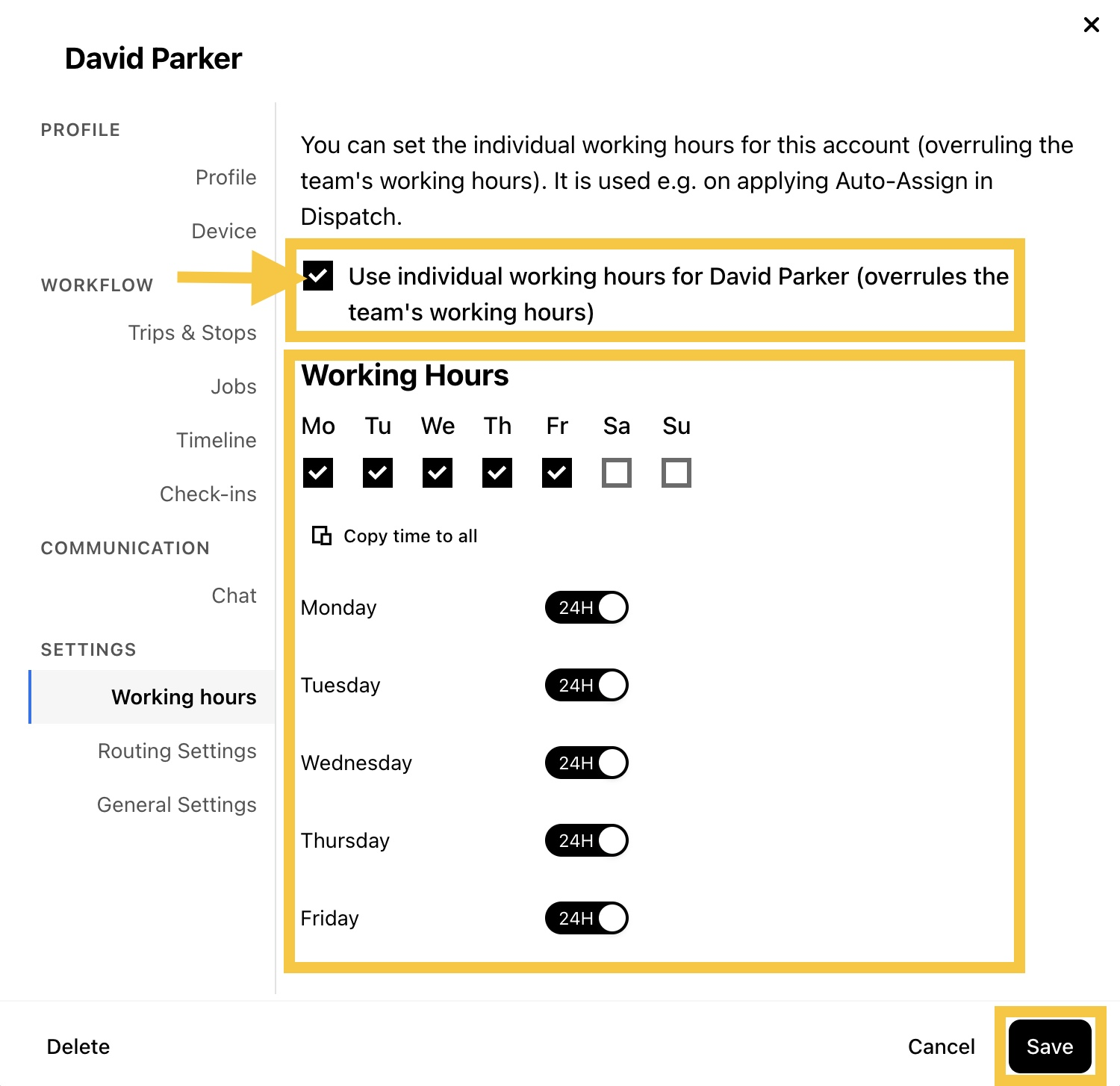 Paso 4: Habilita Usar horario de trabajo individual (Use individual working hours) y establece las horas de trabajo para el miembro, luego haz clic en Guardar (Save).