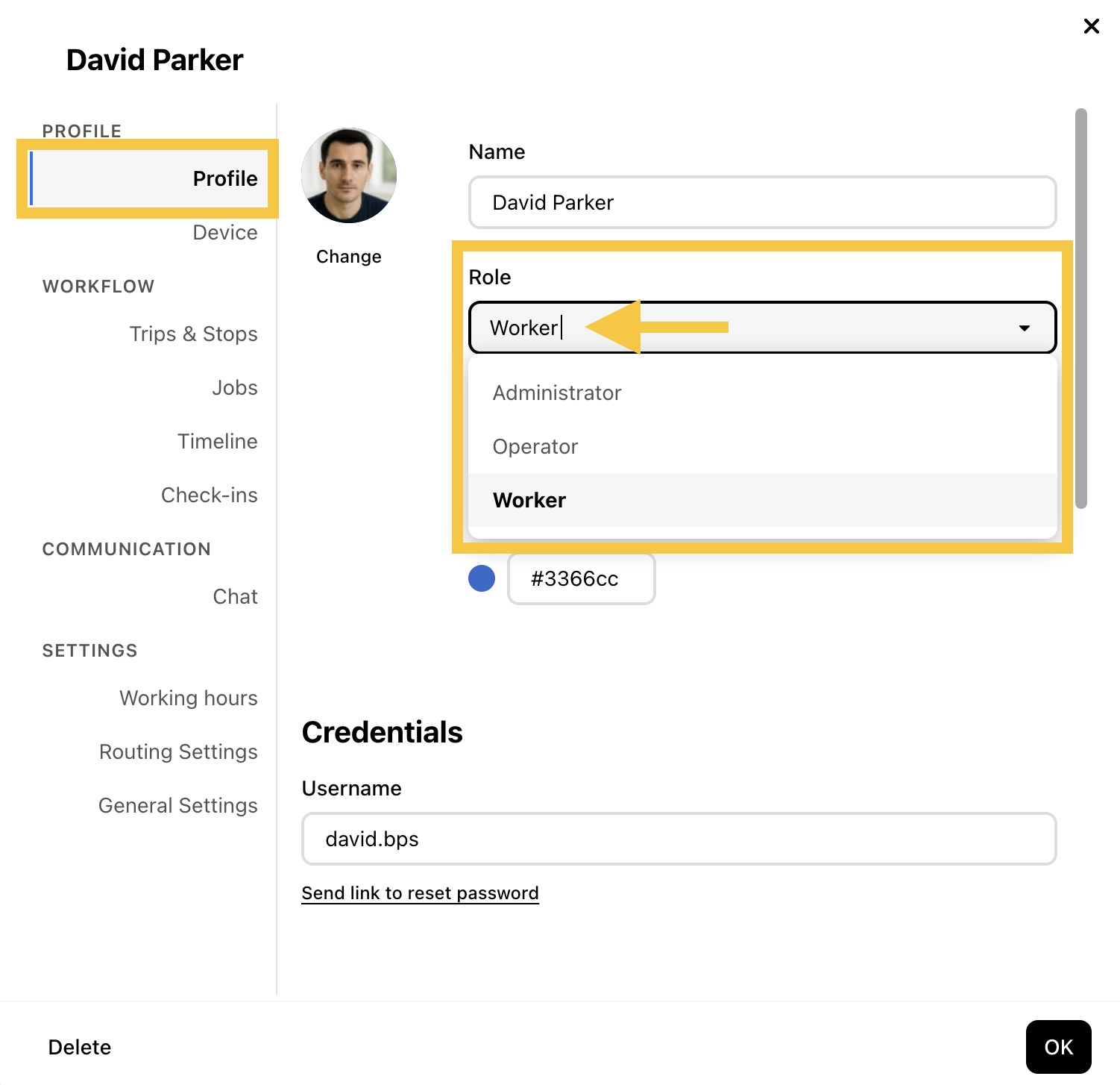 Paso 3: Selecciona Perfil (Profile), luego elige el nuevo rol. Para aprender sobre la diferencia entre cada rol, haz clic aquí.
