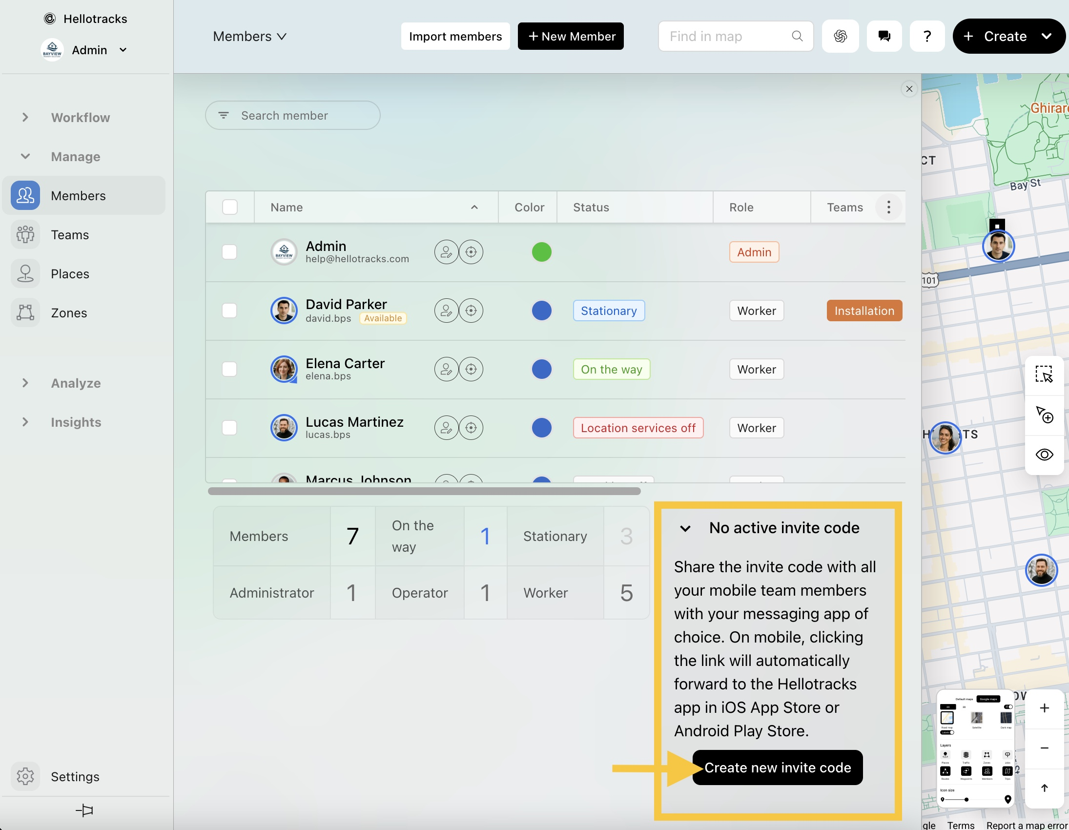 Si un miembro del equipo se registró en la aplicación móvil sin el código de invitación (creando una cuenta de usuario privada), puedes crear y compartir un código de invitación para agregar su cuenta existente a tu cuenta de Hellotracks Business.
