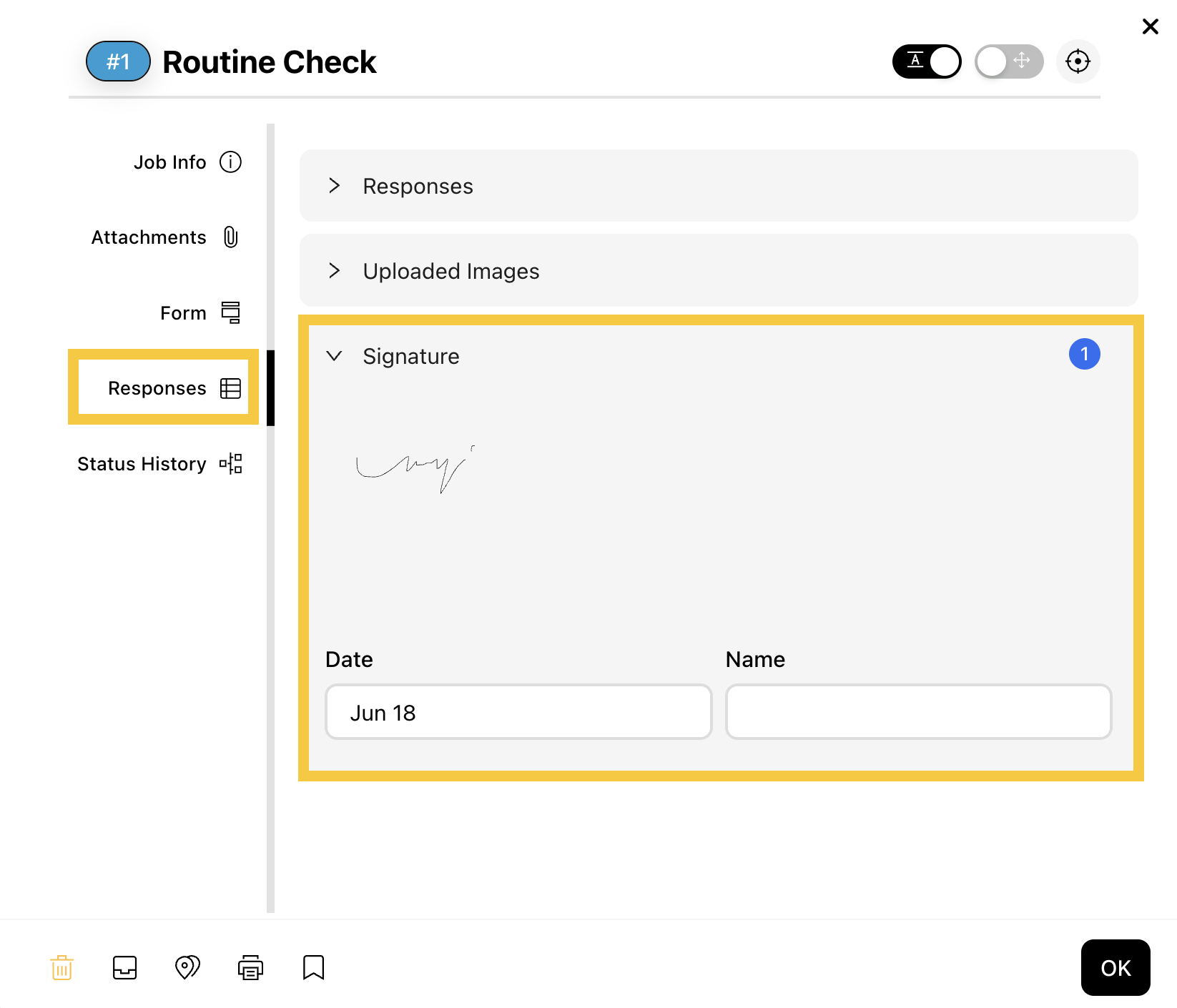 Paso 3: Desde la vista general de la Tarea, selecciona Respuestas (Responses) para ver la firma capturada.